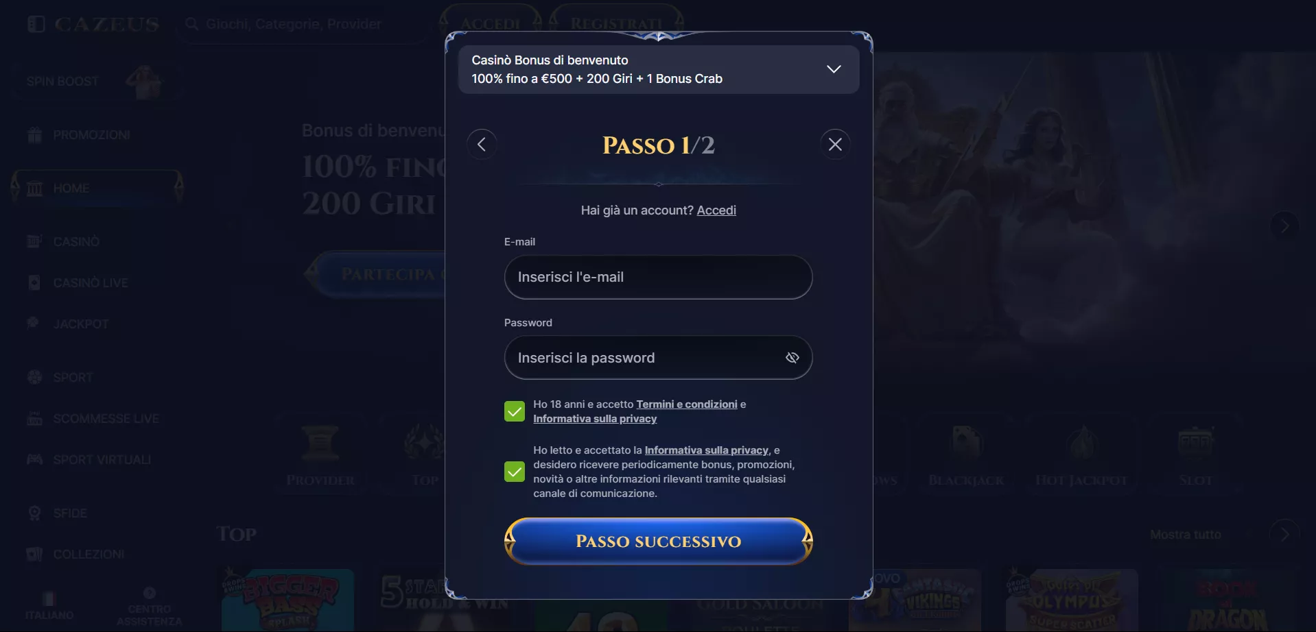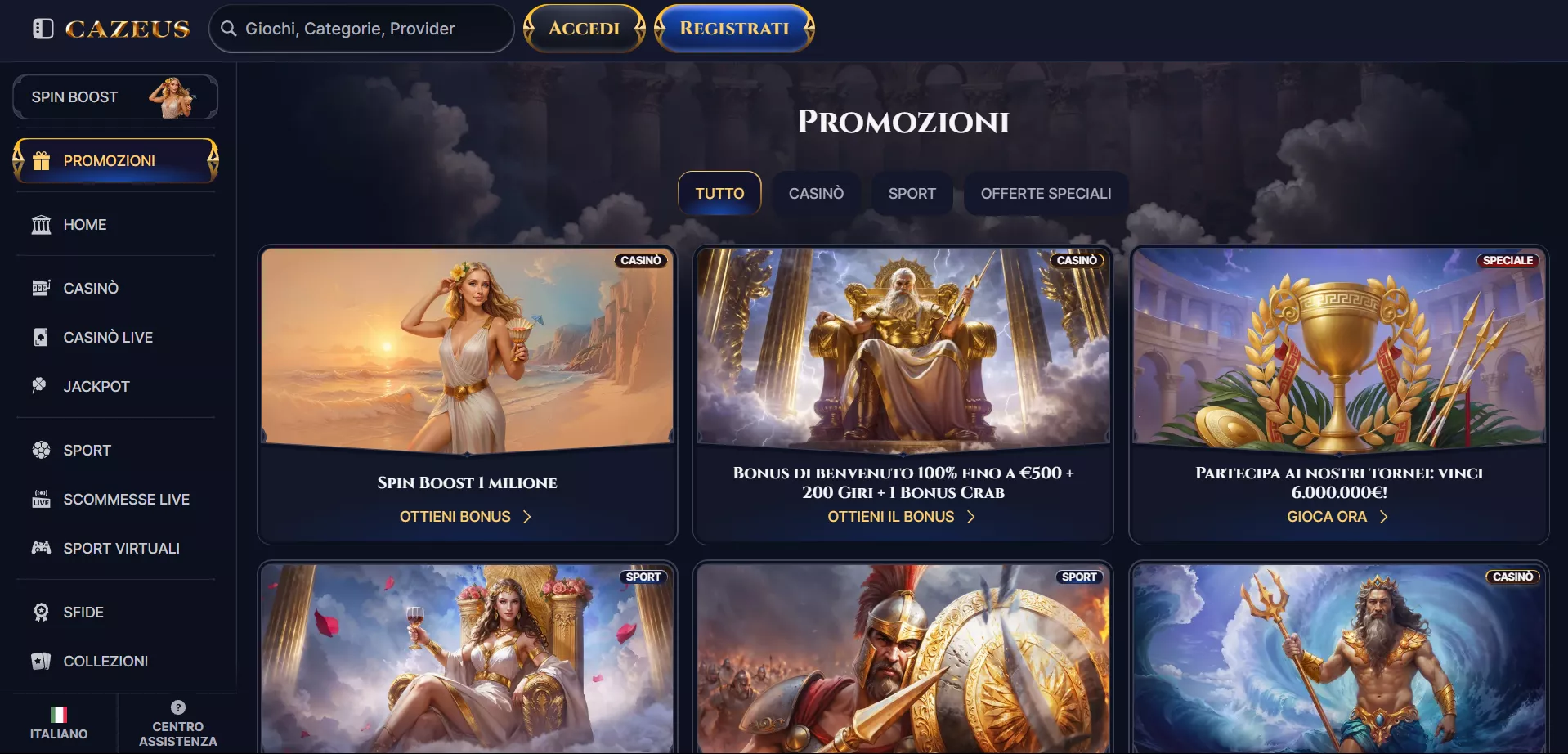 La struttura promozionale di Cazeus risulta particolarmente vantaggiosa per i nuovi iscritti italiani, con offerte differenziate per casinò e sport.