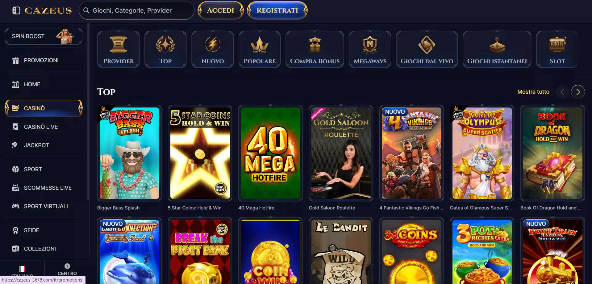 Il casino Cazeus stupisce con una collezione di oltre 9.000+ titoli provenienti da più di 100 sviluppatori leader del settore. Provider del calibro di Evolution Gaming, Pragmatic Play, NetEnt, Microgaming, Play’n GO, Red Tiger e Yggdrasil garantiscono qualità e innovazione costante.