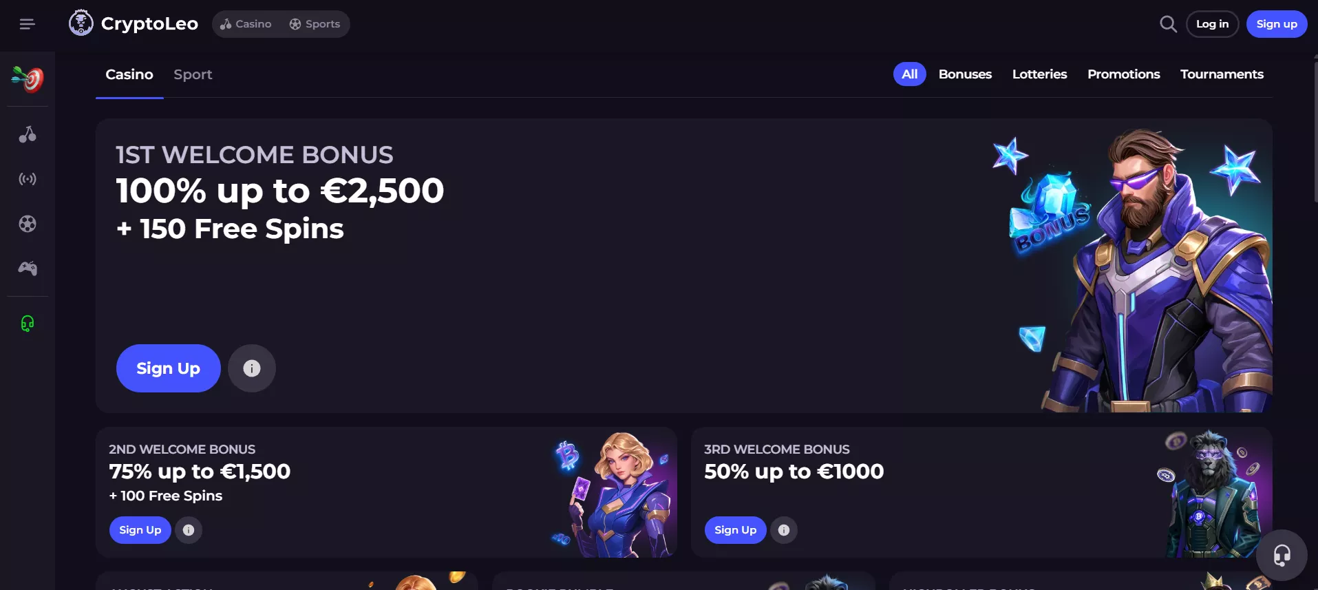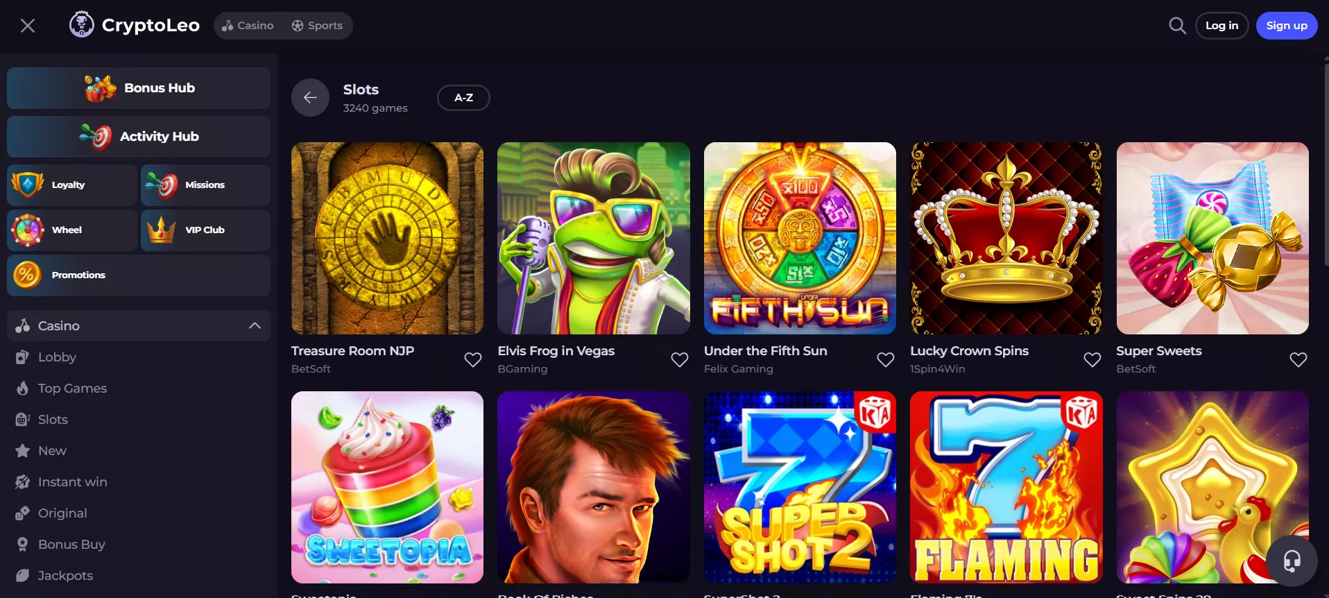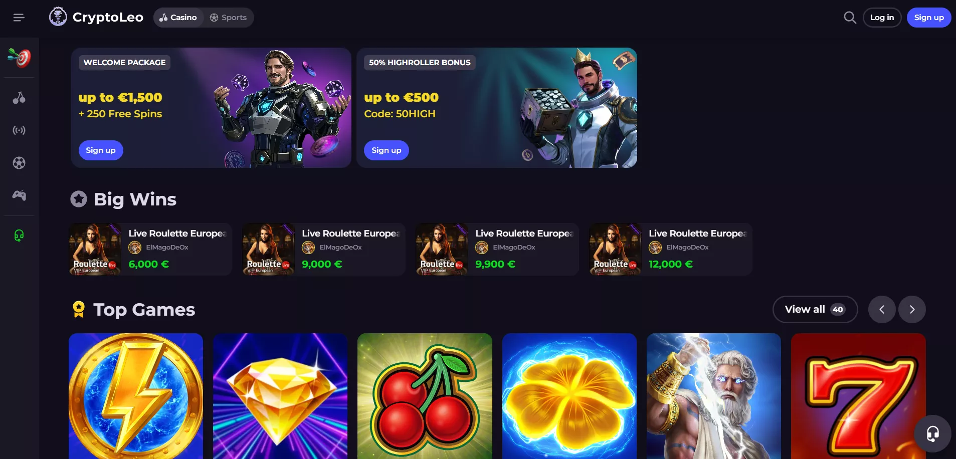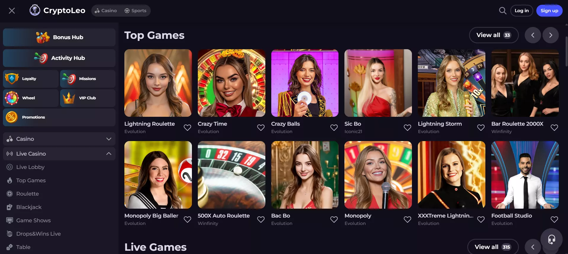 Il portfolio di Crypto Leo vanta oltre 7.500 titoli forniti da 72 sviluppatori premium, inclusi Pragmatic Play, Evolution Gaming, Hacksaw Gaming, Push Gaming e Yggdrasil. La piattaforma si aggiorna quotidianamente con nuove release per mantenere l’offerta sempre attuale.