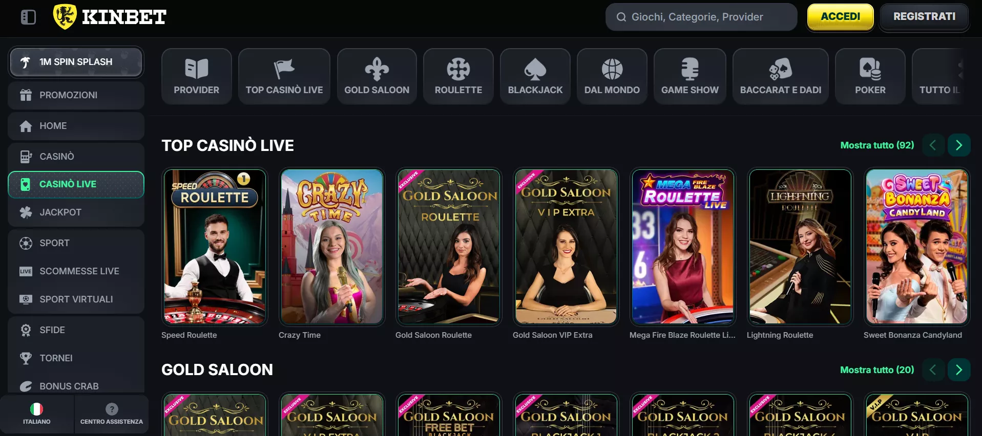 La libreria di Casino Kinbet vanta una collezione impressionante di oltre 3.500 titoli forniti da 47 sviluppatori leader del settore, tra cui NetEnt, Microgaming, Pragmatic Play e Evolution Gaming. Le categorie principali includono: