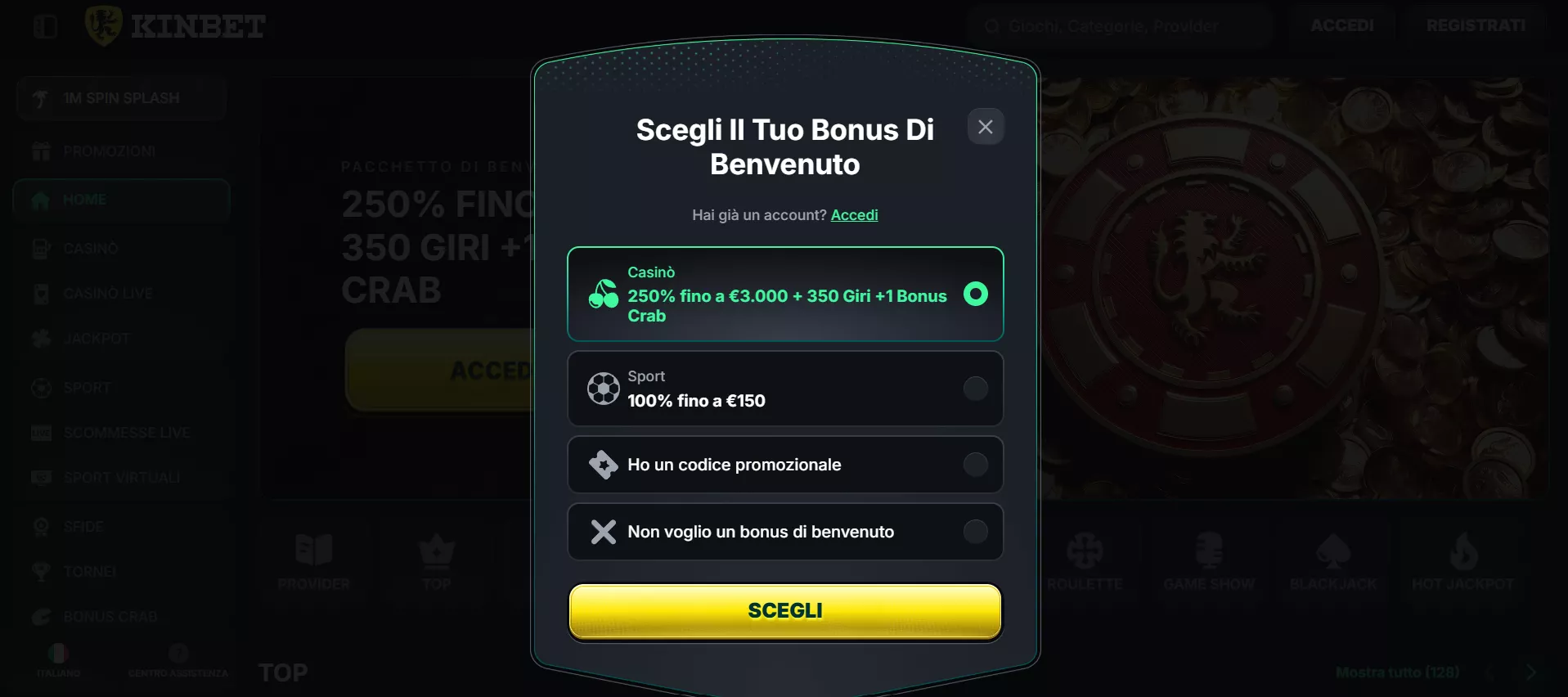 Pacchetto di benvenuto 250% fino a 3000 EUR + 350 giri +1 bonus crab
