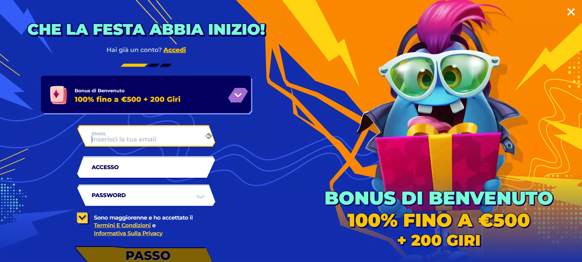 Il bonus casinò prevede 100% fino a €500 sul primo deposito, accompagnato da 200 free spin.
