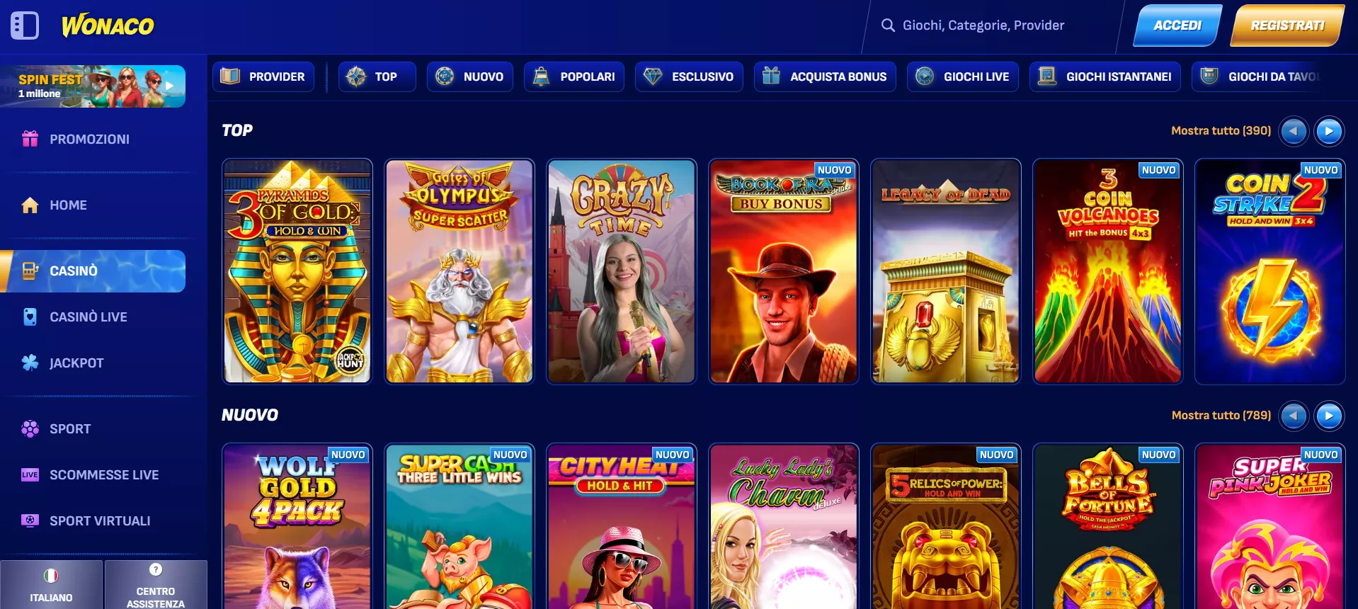 Il portfolio di Wonaco Casino online stupisce con oltre 5.000 titoli provenienti da 62 provider di fama internazionale, tra cui Pragmatic Play, NetEnt, Microgaming, Evolution Gaming e Playtech. La diversità dell’offerta garantisce opzioni per ogni preferenza: